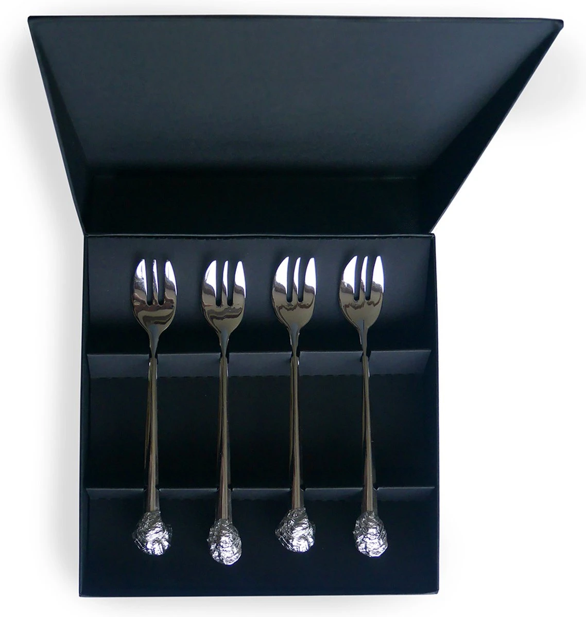 De topstukjes zijn gegoten van zuiver tin en afgeleid van oesterbroed uit de Oosterschelde. Per vier stuks (twee verschillende oestertjes) verpakt in een luxe zwarte doos.