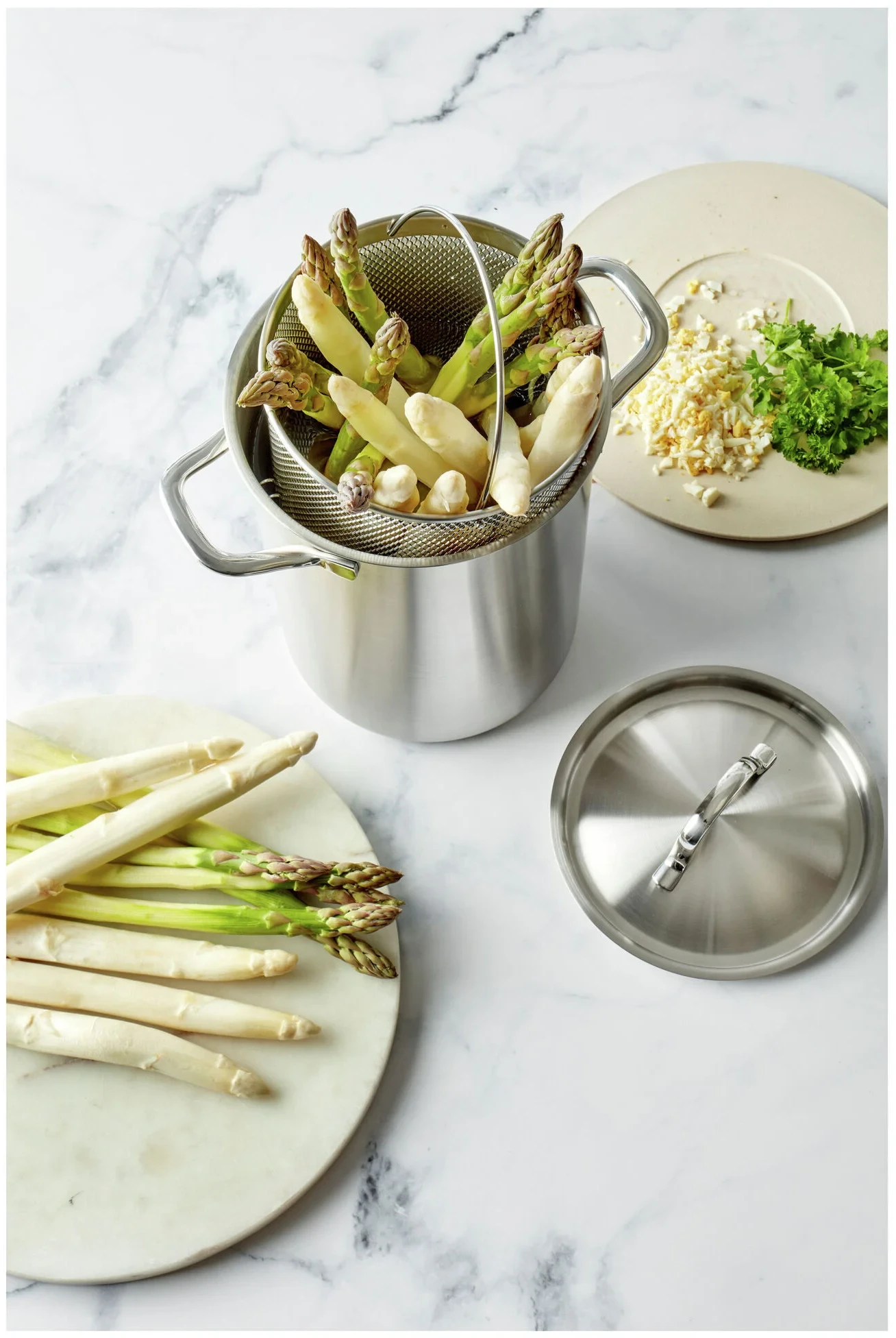 Maar onze aspergekoker heeft nog veel meer te bieden: handige tagliatelle of spirelli kunnen ook worden bereid en je kunt er naar hartenlust andere groenten mee blancheren en koken. De capsulebodem zorgt voor een goede warmtegeleiding. En omdat het oog ook wat wil, is de kookpot zelf mat gepolijst, terwijl het perfect passende deksel glanzend is. De handgrepen zijn stevig gelast en er kan geen vuil of vet tussen komen. Het presteert perfect op alle soorten kookplaten, inclusief inductie.