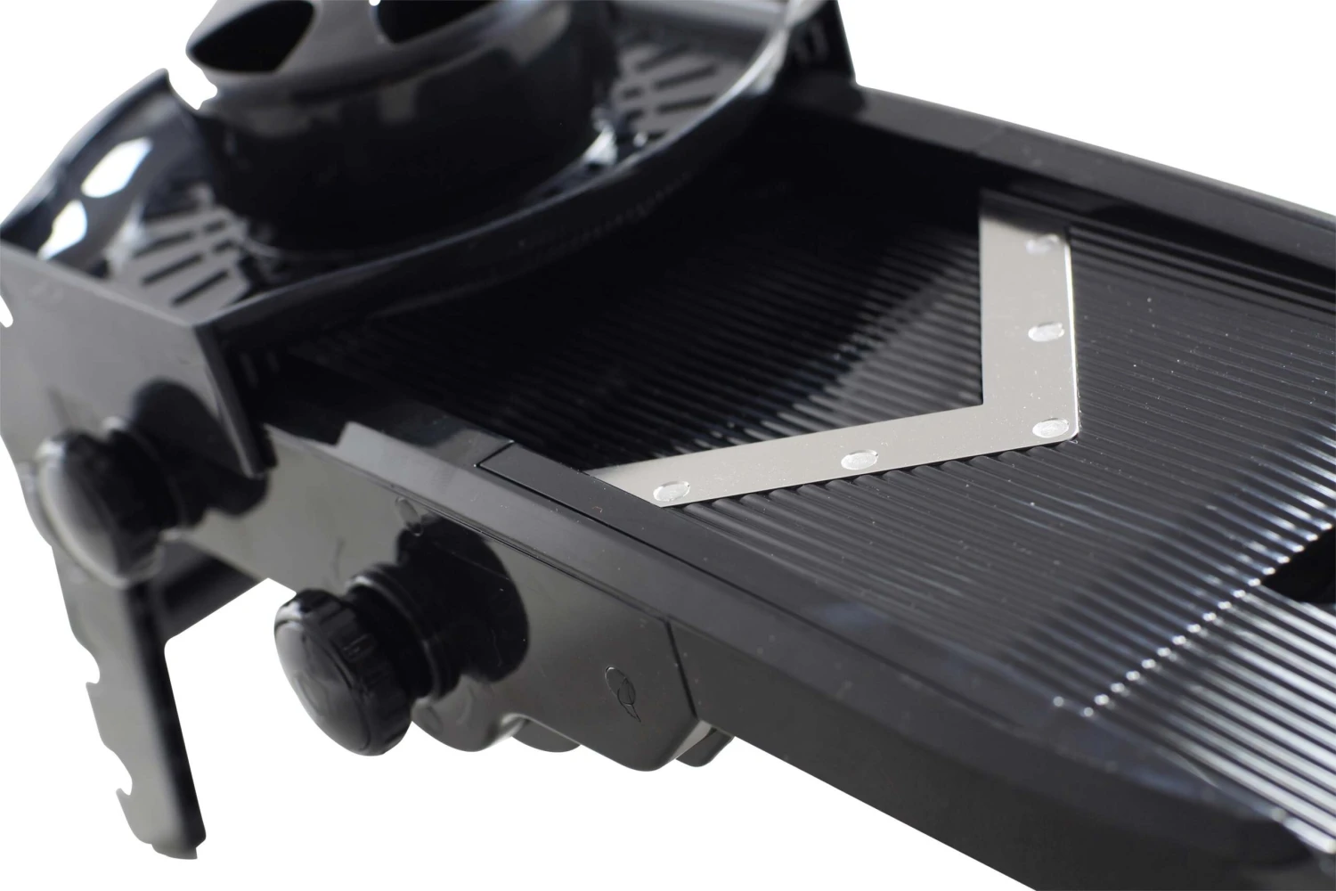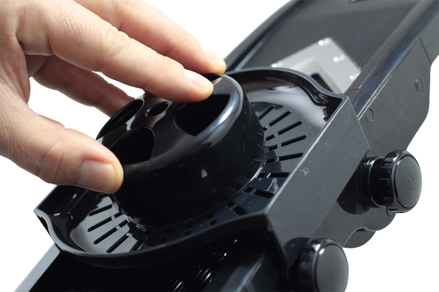 Je hebt volledige controle over de snijdikte, want deze kan ingesteld worden tussen 1 en 9 mm. Of je nu dunne plakjes verkiest of juist wat dikkere stukken wilt snijden, deze mandoline kan het allemaal. Met de meskammen kun je zelfs julienne-strips maken of frites snijden die precies 6 of 9 mm breed zijn.