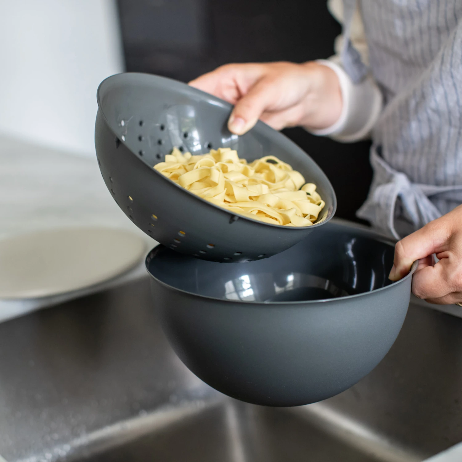 De Koziol Vergiet Palsby Kunststof Grijs ø 21 cm is perfect om noedels, pasta, groente of fruit af te gieten of af te spoelen. Het vergiet van Koziol past perfect in de beslagkom van 2 Liter van Palsby om ruimte te besparen. De perforaties zijn stervormig wat het gietproces sneller laat verlopen en het reinigen makkelijker wordt. Hij kan schoongemaakt worden in de vaatwasser.